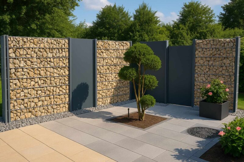 Gabionen bestehen aus Drahtkörben, die mit Steinen oder Naturmaterialien gefüllt werden – je nach Einsatzhöhe als Mauer, Sichtschutz oder Bank. Pflanzgabionen bieten zusätzliche ökologische Vorteile und lockern das Erscheinungsbild auf. Pergolen schaffen mit Rankpflanzen eine grüne, halboffene Struktur.